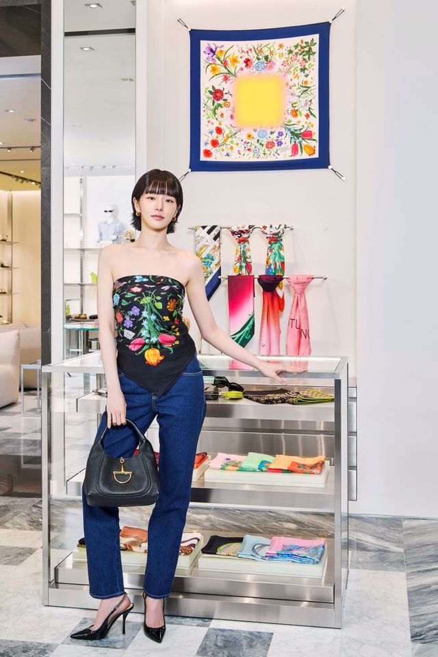 이날 박규영은 구찌 실크 스카프를 탑으로 스타일링한 뒤 데님과 구찌 시뇨리아 슬링백을 매치했으며, 블랙 색상의 구찌 소프트빗 핸드백으로 룩을 완성해 새로운 계절의 무드가 담긴 감각적인 룩을 선보였다.