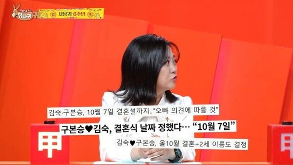 김숙은 지난 14일 '사당귀' 방송에서 '가을쯤 결혼할 생각이냐'는 박명수의 질문에 "(구본승) 오빠의 의견에 따르겠다"고 했고, 박명수는 "그럼 10월 7일 결혼하라"고 해 결혼설이 제기됐다.