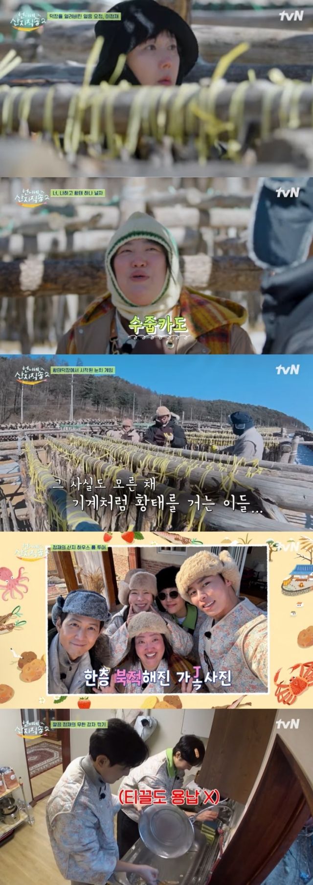 황태 120마리를 걸어야 비로소 한 목이 완성되는 고된 작업. 언니즈 염정아, 박준면과 막내즈 임지연, 이재욱이 2인 1조로 호흡을 맞춘 가운데 이정재는 허리를 펼 새도 없이 양쪽을 번갈아 도우며 작업 속도를 끌어올렸다. 이정재는 직송비에 진심인 가장 염정아를 향해 "(예능인데) 말도 안 하고 일만 하시네"라고 말해 폭소를 자아내기도.