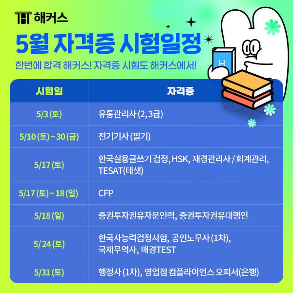 재경관리사, 행정사 시험 강의부터 매경테스트, HSK, 실용글쓰기 자격증까지 다양한 교육 콘텐츠를 제공하는 해커스 교육그룹이 2025년 5월에 예정된 자격증 시험 일정 정보를 공개했다.