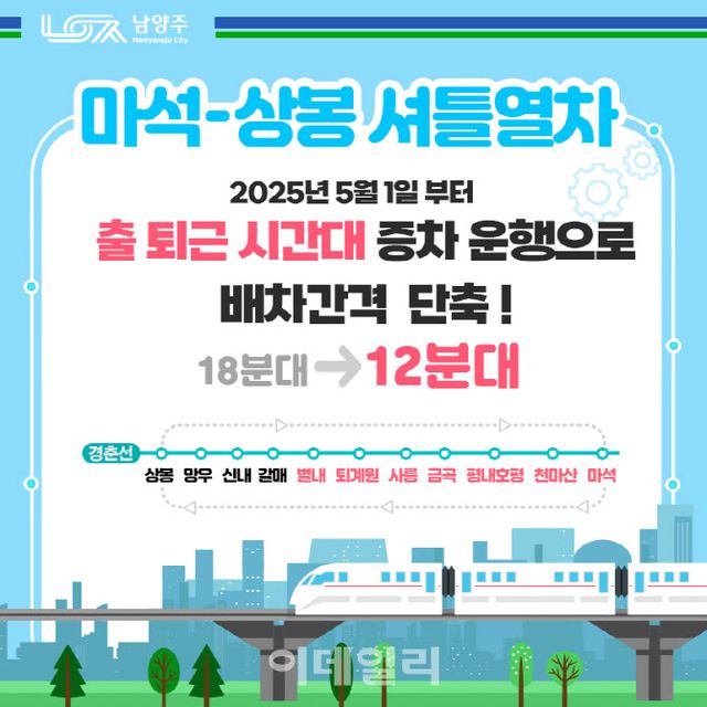 경기 남양주시는 5월 1일부터 경춘선 마석역과 서울 상봉역을 연결하는 셔틀열차를 운행한다고 28일 밝혔다.