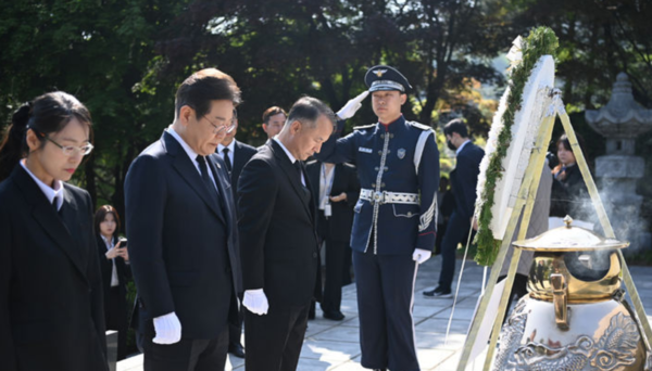 이재명 제21대 대통령 선거 더불어민주당 대선 후보가 28일 오전 서울 동작구 국립서울현충원 내 고(故) 이승만 전 대통령 묘역을 찾아 참배하고 있다. /사진=뉴시스