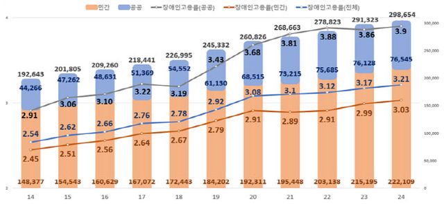 윤석열 정부 이후 장애인 공무원 수는 꾸준히 줄어들고 있다. 중앙행정부처와 헌법기관, 지방자치단체, 교육청 등 정부부문에서 고용한 장애인 공무원 순인원은 2021년 말 2만 3668명까지 올랐지만, 이듬해 감소하기 시작해 지난해 말 2만 3422명을 기록했다. 3년 만에 1%(246명) 감소한 규모다. 같은 기간 전체 장애인 근로자 순인원은 9%(1만 8681명) 늘었으나 공무원 장애인만 유일하게 줄었다. 반면 최저임금 수준을 받는 공무직 장애인 근로자는 17%(2890명) 급증했다.