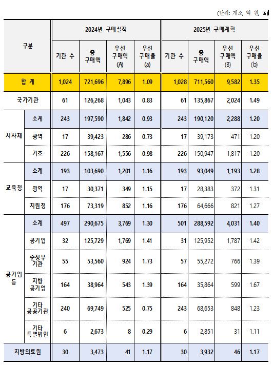한편 올해 공공기관 전체 총 구매계획은 71조 1560억원이다. 각 공공기관에서 제출한 올해 우선구매 계획은 2024년 실적 대비 1686억원 증가한 9582억원이며, 우선구매 비율은 1.35%로 확정됐다.