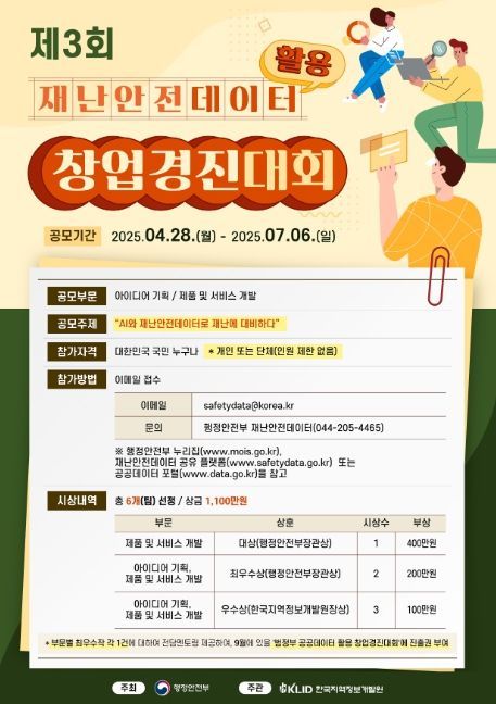 [와이뉴스] 행정안전부는 4월 28일부터 7월 6일까지 ‘제3회 재난안전데이터 활용 창업경진대회’를 개최한다고 밝혔다.