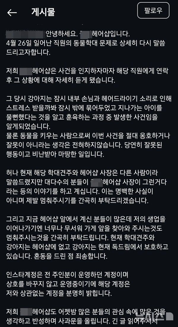 B씨는 해명글에서 "사건을 인지하자마자 해당 직원에게 연락해 상황에 대해 자세하게 듣게 됐다"며 "당시 내부 손님과 헤어드라이기 소리로 인해 스트레스를 받을까 봐 개를 잠시 밖에 묶어 뒀다"라고 말했다.