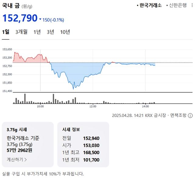 국내 금시세(금값)가 28일(한국 시각) 오후 하락세(전 거래일 대비)를 보이고 있다.