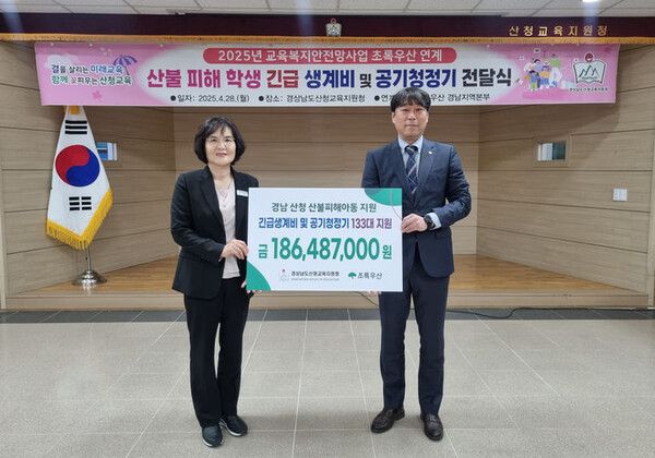 초록우산 경남지역본부 조유진 본부장은 “예상치 못한 산불로 인해 힘든 시간을 보내고 있을 학생들에게 조금이나마 도움이 될 수 있어 다행"이라며 “앞으로도 산청교육지원청과 긴밀한 협력을 통해 지원을 지속적으로 확대해 나가겠다”고 밝혔다.