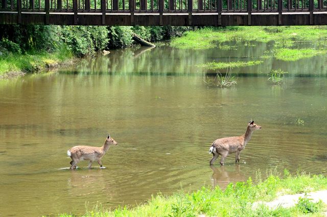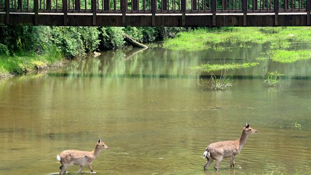 대전 유성구 국립대전현충원에서 꽃사슴 두 마리가 야생화공원 주변 냇물을 건너고 있다. 기사 이해를 돕기 위한 자료 사진 / 국립대전현충원 제공-연합뉴스