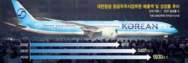 첨단 항공기술까지 사업 다각화에 나서면서 매출도 성장 중이다. 지난해 대한항공 항공우주사업부 매출은 5930억원으로 전년 대비 9.7% 성장했다. 2022년 4910억원, 2023년 5407억원에 이어 매년 안정적인 성장세를 이어가고 있다.