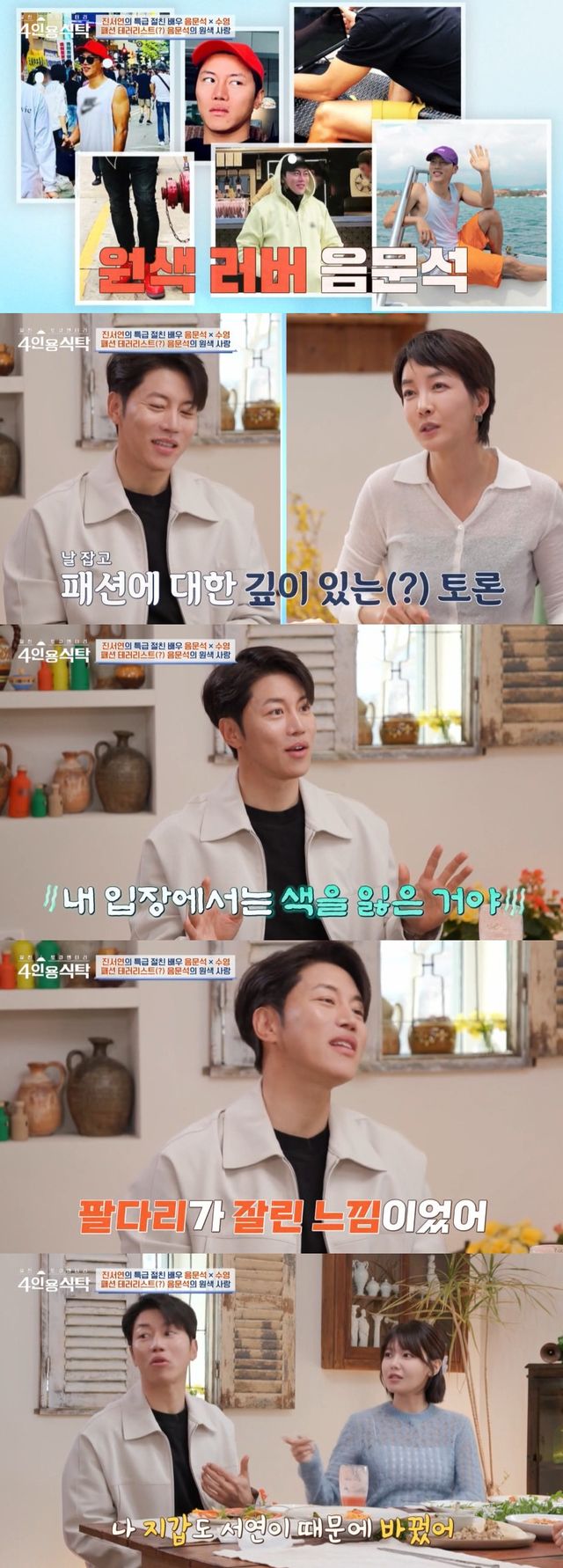 이날 음문석은 "진서연 때문에 색을 잃었다"고 운을 뗐다. 이에 수영은 "오빠는 좀 잃었어야 한다. 처음에 오빠 만났을 땐 원색에 완전 래퍼였다. 원숭이 그려진 옷에 징이 박힌 클러치였다"며 과거 그의 패션을 회상했다.