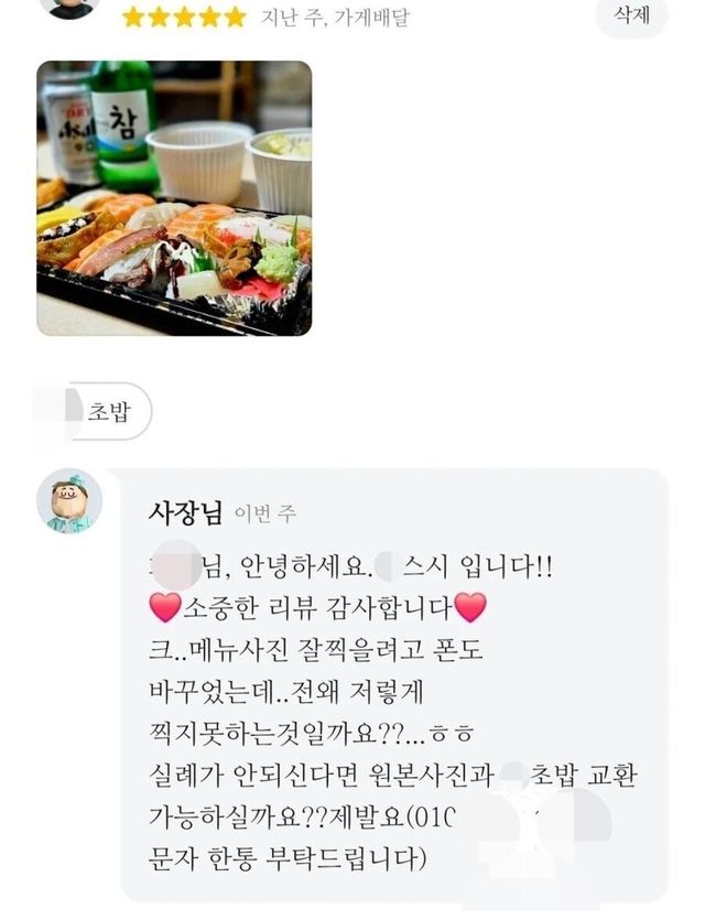“소중한 리뷰 감사합니다. 메뉴 사진 잘 찍으려고 휴대폰도 바꿨는데 전 왜 이렇게 찍지 못하는 것일까요? 실례가 안 된다면 원본 사진과 초밥을 교환할 수 있을까요? 제발요. 문자 한 통 부탁드립니다.”