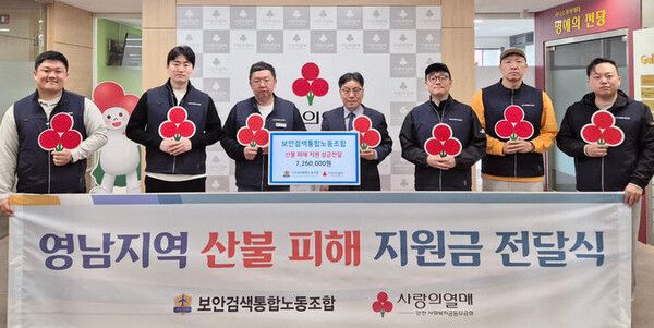뉴시스 보도에 따르면, 인천공항 보안검색통합노동조합은 28일 인천 남동구 사회복지공동모금회(사랑의열매)에서 영남지역 산불 피해 복구성금 726만원을 전달했다고 밝혔다.