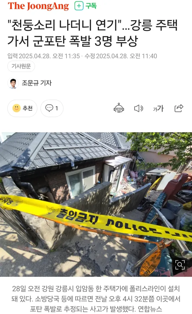 고물상에서 분류작업을 하던 중에 포탄이 폭발하여 3명 부상..