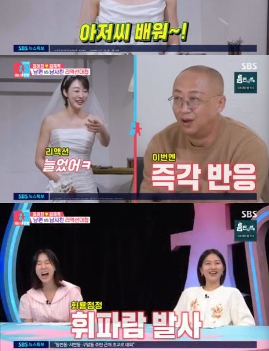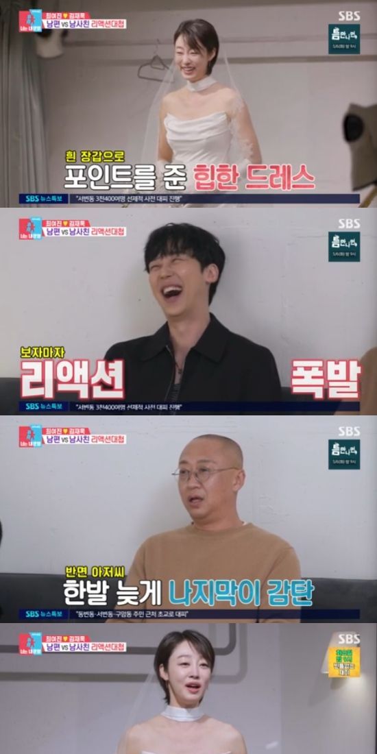 업무 통화를 위해 잠시 자리를 비웠던 김재욱은 뒤늦게 최여진의 웨딩드레스 자태를 본 김재욱은 기계적인 리액션을 날렸다. 반면 윤종훈은 리액션의 정석을 보여줬고, 이에 김재욱은 최여진이 드레스를 입고 나올 때마다 휘파람을 발사하는 등 과한(?) 리액션으로 웃음을 줬다.