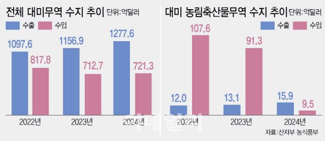 정부는 농업분야 대(對)미 무역 수지는 적자라는 점을 이유로 농축산물이 협상 테이블에 오를 가능성은 낮다고 보는 분위기다. 다만 다른 협상의 지렛대로 활용할 가능성은 배제하지 않고 있다. 농식품부 관계자는 “구체적인 건 실무 협의를 시작해야 알 수 있을 것”이라고 말했다.