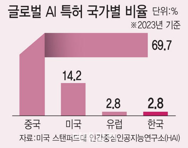 실제로 미국 스탠퍼드대 인간중심인공지능연구소(HAI)가 이달 초 내놓은 보고서에 따르면 2023년 국가별 AI 특허 점유율은 중국(69.7%)과 미국(14.2%)이 전체의 80% 이상을 차지하는 가운데 한국(2.8%)은 상대적으로 미미한 수준에 그쳐 있다.
