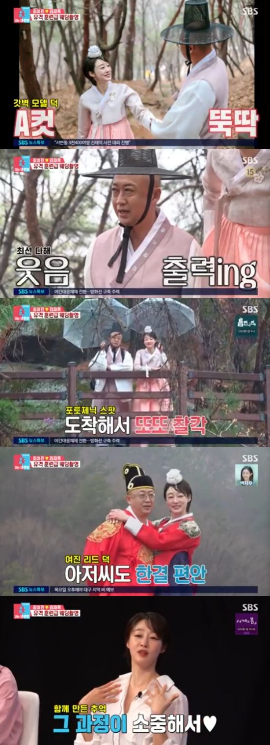 이날 방송에서 최여진♥김재욱 커플은 웨딩 촬영을 위해 한복으로 풀세팅을 하고 등장했다. 최여진은 "스튜디오 촬영 보다는 자연의 모습이 담겨있는 사진을 찍고 싶었다"면서 빗속을 뚫고 웨딩 촬영장소로 향했다.