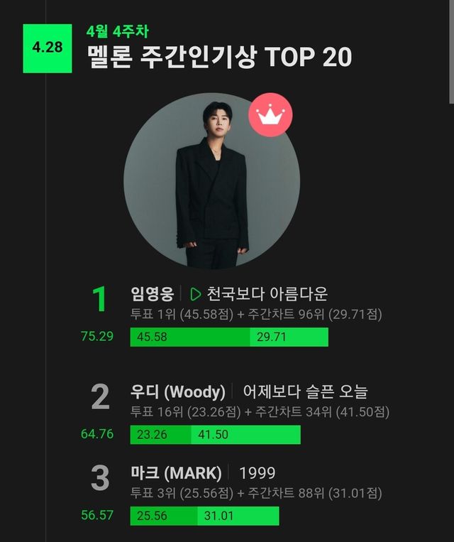 임영웅은 멜론이 집계한 4월 4주차 주간 인기상 투표에서 우디(64.76점), 마크(56.57점)를 제치고 압도적인 점수로 정상에 올랐습니다.