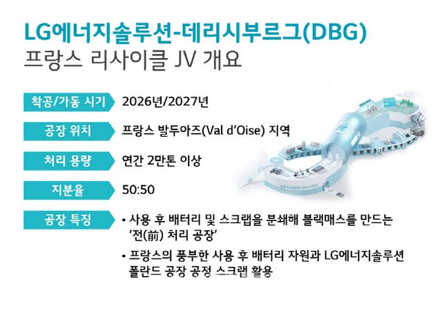 신규 합작 법인은 프랑스 북부 발두아즈 지역 브뤼에르 쉬르 우아즈에 내년 공장을 착공한 뒤 오는 2027년 본격 가동을 시작한다. 연간 2만t 이상의 사용 후 배터리 및 스크랩(Scrap) 처리 능력을 갖출 예정이다.