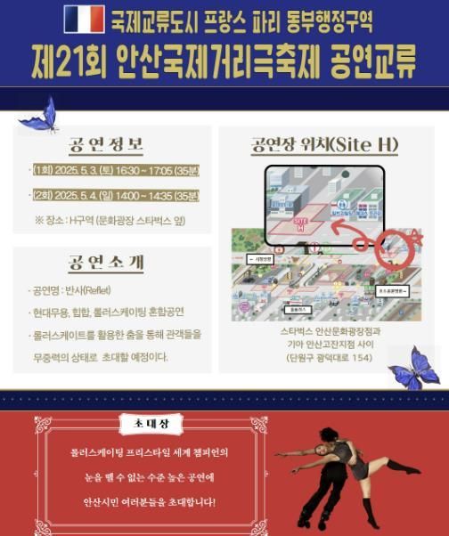 이번 축제에서 선보일 공연은 ‘반사(Reflet)’라는 인라인스케이트 듀오 공연으로 현대무용, 힙합, 시각예술이 결합한 하이브리드 공연이다. 파리 동부행정구역 예술공연단은 3일 16시 30분과 4일 14시에 안산문화광장 H구역에서 공연을 펼칠 예정이다.