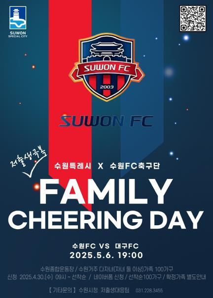 이번 관람 지원 경기는 5월 6일 열리는 수원종합운동장에서 열리는 수원 FC 대 대구 FC의 축구 경기다. 4월 30일 오전 9시부터 다자녀 가구 100가구를 대상으로 선착순 신청을 받는다. 홍보물 포스터에 있는 큐알(QR)코드에 연결된 웹페이지에서 신청하면 된다.