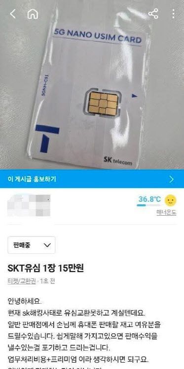 SK텔레콤의 유심(USIM) 해킹 사태로 정보 유출 불안감이 확산되며 유심 수급이 어려워진 가운데 SK텔레콤 유심을 판매하는 글이 중고마켓 앱에 올라와 논란이 일고 있다.