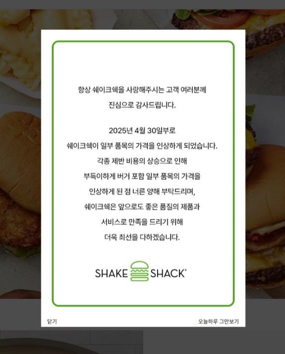 쉐이크쉑 가격 인상 공지 팝업. / 쉐이크쉑 홈페이지 캡처