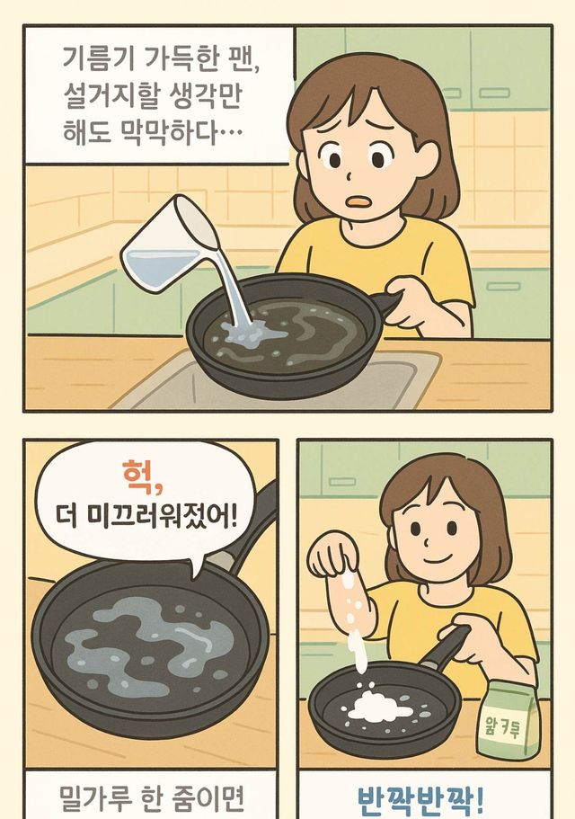 밀가루를 팬에 골고루 뿌린 뒤 잠시 기다리면 밀가루가 기름을 흡착해 덩어리를 만든다. 이 덩어리를 키친타월로 가볍게 쓸어내기만 하면 팬의 기름기 문제는 거의 해결된다. 이후 따뜻한 물로 헹구고 소량의 세제로 마무리 세척을 하면 된다.