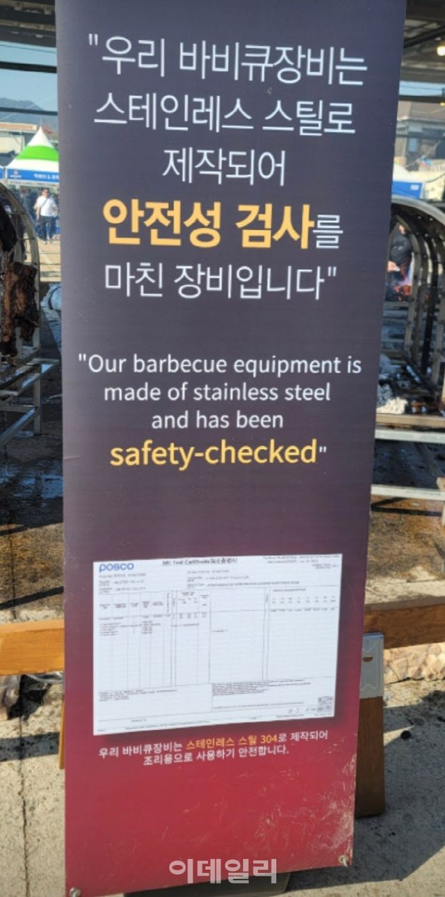 해당 배너에는 ‘우리 바비큐 장비는 스테인레스 스틸로 제작돼 안전성 검사를 마친 장비다’는 문구와 함께 해당 산업용 금속에 대한 포스코 인증서가 담겼다. 다만 이 포스코 인증서는 식약처의 식품용 적합성 인증과는 아무런 관련이 없다는 의혹이 제기됐다.