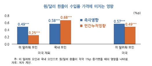 이를테면 강달러 요인으로 1분기에 환율이 1%포인트 상승할 경우, 미국을 제외한 국가로부터의 수입품 가격은 같은 분기에 0.49%포인트 상승한 후 환율의 영향이 점차 줄면서 1년 누적으로는 0.25%포인트 증가했다. 반면 국내 요인으로 환율이 1%포인트 상승한 경우엔 수입품 가격은 해당 분기에 0.58%포인트 상승한 후 1년 누적으로는 0.68%포인트로 더 증가한 것으로 나타났다.