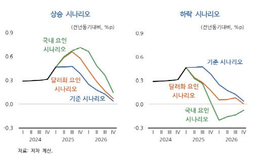 물가상승률 변동 폭은 환율이 미국의 통상정책 불확실성 등 대외 요인(달러화 요인)으로 상승했을 때보다 탄핵정국 등 국내 요인으로 올랐을 때 더 큰 것으로 나타났다. 달러화 요인으로 상승할 경우 3분기 물가상승률은 1분기 대비 0.19%포인트까지 오른 이후 그 영향이 점차 감소했다. 그러나 국내 요인으로 상승한 경우엔 물가상승률이 4분기 0.24%포인트 올라 정점을 찍은 후 점진적으로 조정될 것으로 예상했다.