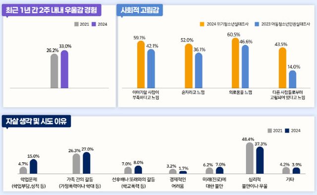 최근 1년간 자살 시도 경험은 8.2%로 3년 전(9.9%) 대비 1.7%포인트 감소한 반면, 자해를 시도해봤다는 비율은 2.8%포인트 증가한 21.5%로 늘었다. 자살을 시도한 이유로는 심리불안(37.3%)을 호소하는 경우가 가장 많았고, 가족간의 갈등(27%)이나 학업 문제(15%)를 꼽는 비율은 2021년보다 높아졌다. 자해를 생각하거나 시도하게 된 사유는 △그냥 죽고 싶은 생각이 들어서(55.6%) △스트레스를 풀고 편안함을 느끼기 위해(44.8%) △나쁜 기분을 멈추기 위해(40.1%) 순으로 집계됐다.