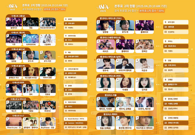 ‘아시아 스타 엔터테이너 어워즈 2025’(이하 ‘ASEA 2025’)’ 본투표 2차 순위 경쟁이 치열하다.