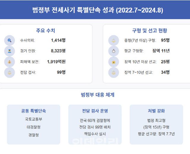 양 검사는 “범정부 전세사기 특별단속을 통해 2022년 7월부터 지난해 8월까지 사기 의심 1414명에 대해 수사의뢰가 이뤄졌고, 사기범 8323명을 검거했다”고 밝혔다. 이 기간 피해액 1919억원을 보전했으며, 25명에 대해 징역 10년 이상의 유죄가 선고됐다.