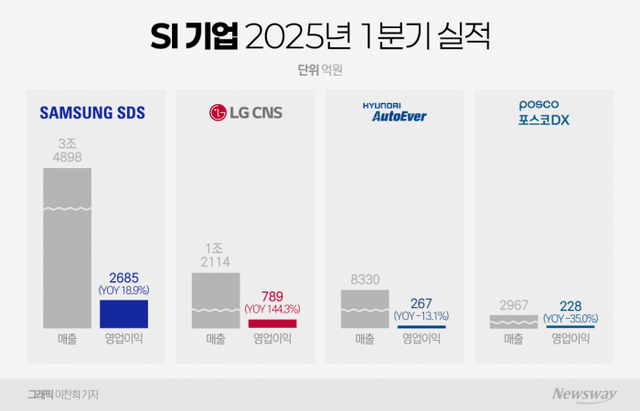반면, 현대오토에버와 포스코DX는 실적 감소세다. 현대오토에버는 매출 8330억원, 영업이익 267억원을 기록했다. 전년 동기 대비 각각 13.9% 늘었고, 13.1% 감소했다. 포스코DX 역시 매출 2967억원, 영업이익은 228억원으로 집계됐다. 이는 전년 동기 대비 각각 32.6%, 35% 줄었다.