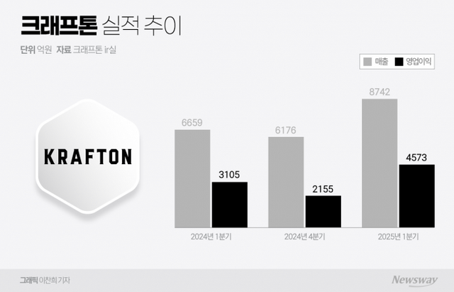 크래프톤은 올해 1분기 연결 기준 매출 8742억원, 영업이익 4573억원을 기록했다고 29일 밝혔다. 전년 동기 대비 각각 31.3%, 47.3% 증가한 수준으로, 매출과 영업이익 모두 크래프톤 분기 역대 최대 실적에 해당한다.