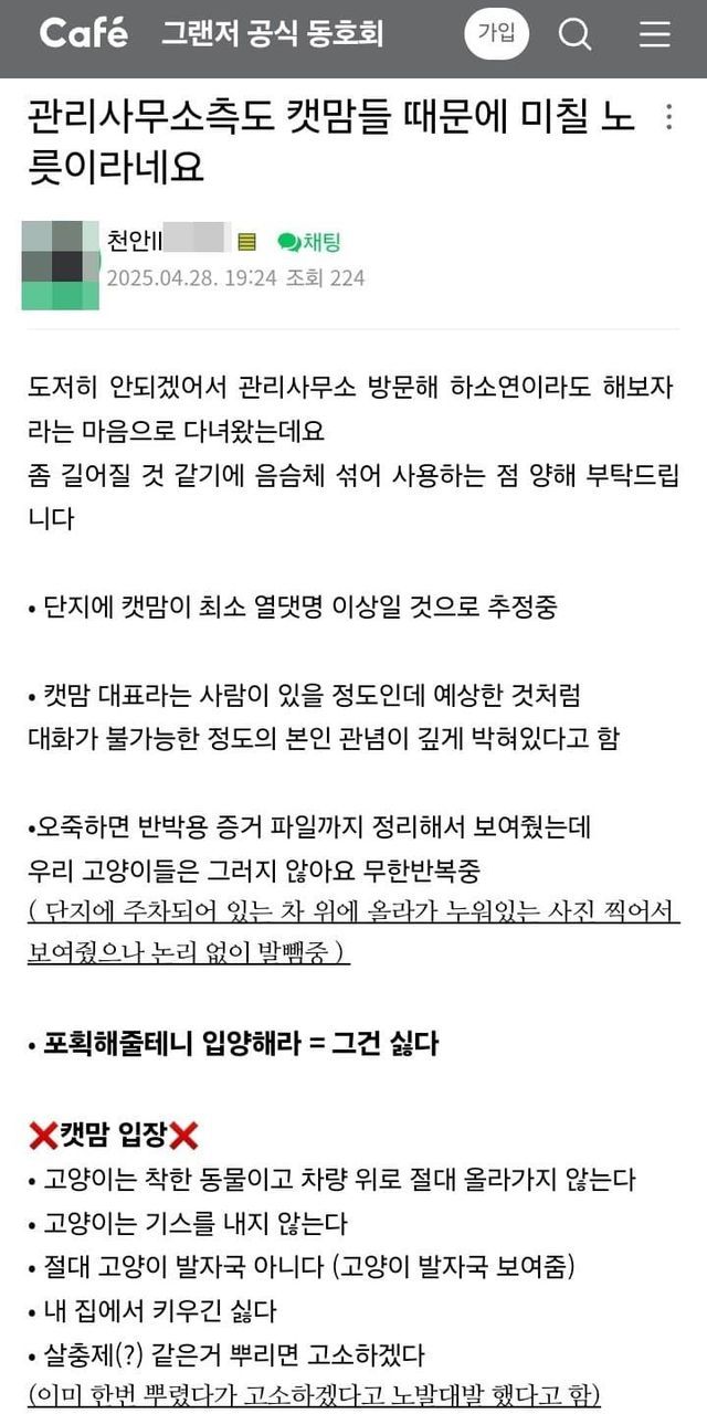 캣맘들 종특 때문에 차주와 관리사무소가 미칠 지경임