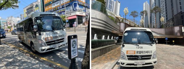 (왼)검단사거리역 1분 출구 인근에서 단지로 운행 중인 셔틀버스. (오)단지 내에서 운행하는 셔틀버스. = 박선린 기자