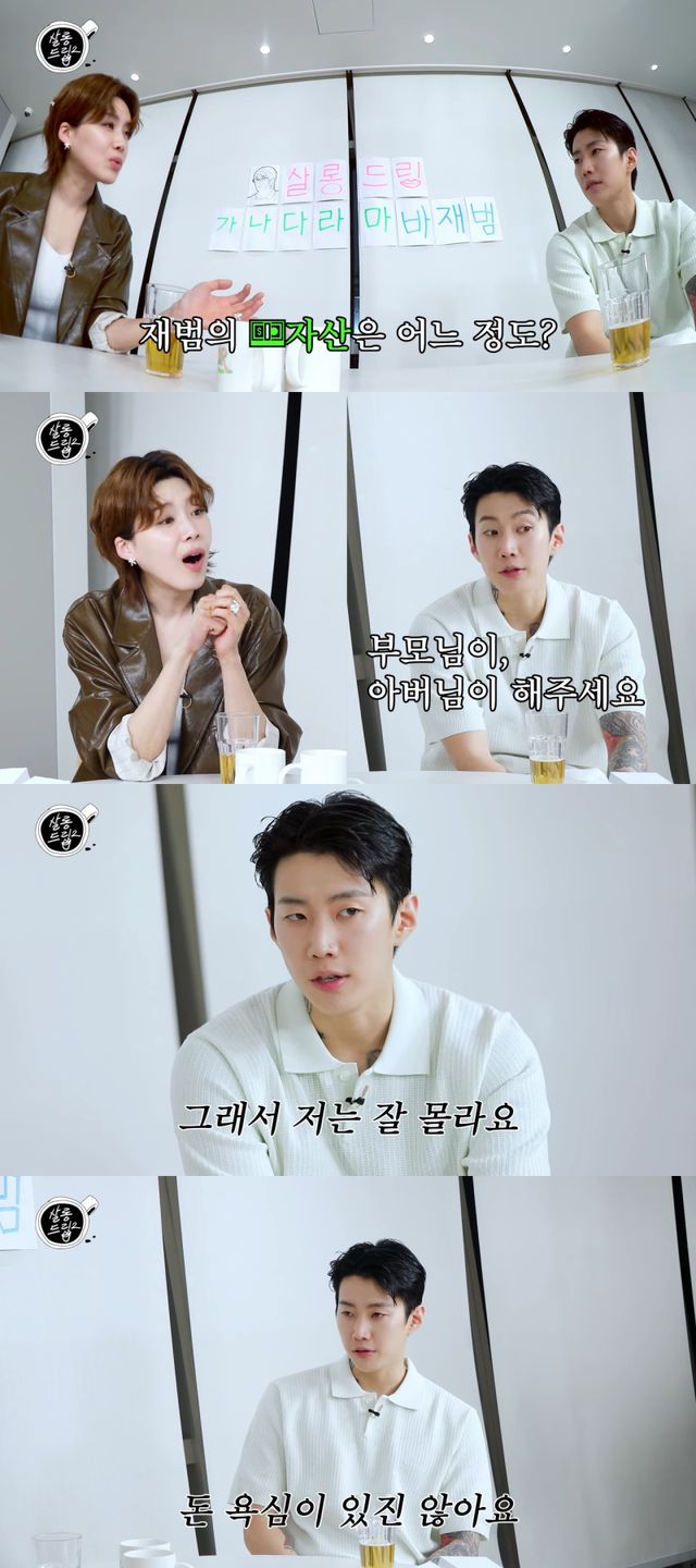 이날 장도연은 “자산에 대한 이야기가 많다. 박재범은 과연 얼마를 모았는지”라고 묻자 박재범은 “모은 것은 잘 모르겠다”며 “자산 관리는 아버지가 해주신다. 그래서 저는 잘 모른다”고 말했다.