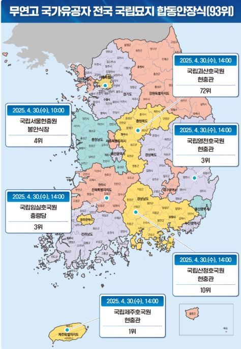 국가보훈부는 전국 공설 봉안시설 무연고실에 안치된 국가유공자 유해 93위를 찾아 30일 국립서울현충원을 비롯한 전국 6개 국립묘지에서 합동 안장식을 거행한다고 밝혔다.
