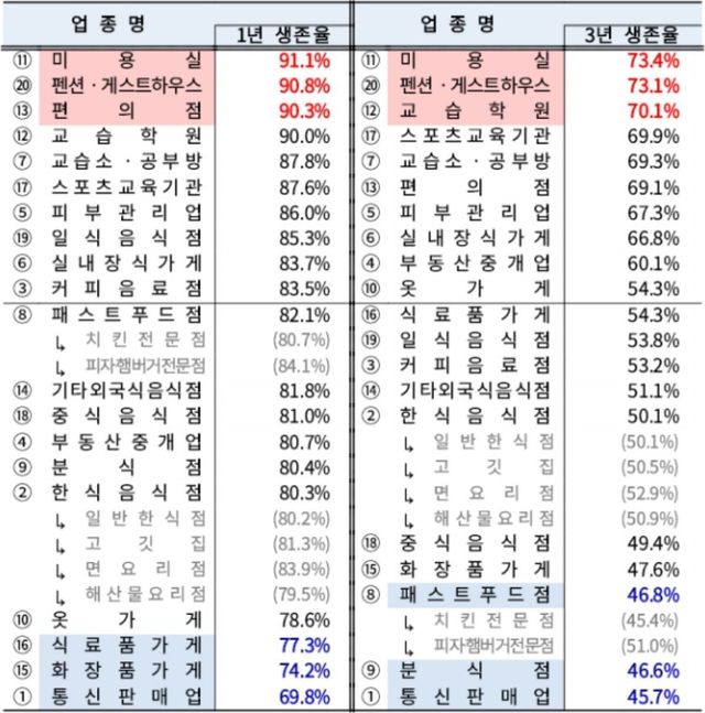 3년 생존율 기준으로는 미용실이 73.4%로 가장 높았다. 이어 펜션·게스트하우스 73.1%, 교습학원 70.1% 순이었다. 통신판매업은 45.7%, 분식점 46.6%, 패스트푸드점 46.8%로 낮은 수준이었다. 생존율이 높은 세 업종은 모두 70%를 넘기며, 100대 생활업종 평균인 53.8%보다 크게 높았다.