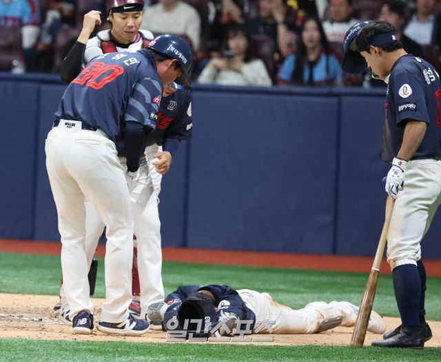 온전히 웃을 순 없었다. 올 시즌 '히트상품', 리그 타율 1위(28일 기준 0.378)였던 전미재가 7회 초 타석에서 상대 투수의 투심 패스트볼에 머리를 맞고 병원에 이송된 것. 다행히 헬멧에 맞고 충격이 줄었지만, 그대로 들것에 실려나가 큰 부상이 우려됐다.