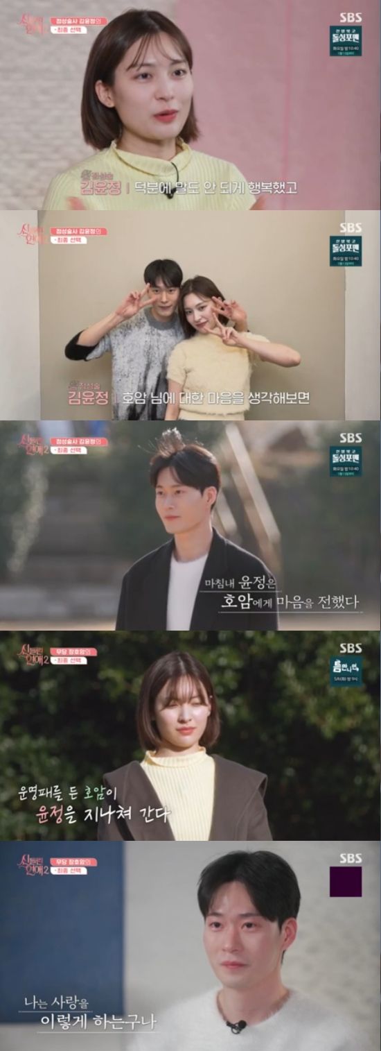 김윤정은 장호암을 선택했다. 뒤늦게 장호암을 향한 확신을 가지고 마음을 전했던 김윤정은 이날에도 "제 마음을 확인한 순간부터는 집중했다. 엄청 용기를 냈다. 정말 진심이었다. 덕분에 말도 안되게 행복했다"면서 눈물을 보였다.