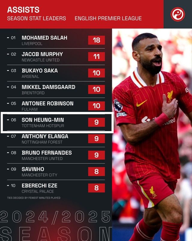 축구 통계 매체 '스쿼카'에 따르면 손흥민은 이번 시즌 총 16회의 결정적인 찬스를 만들었다. 이는 모하메드 살라(리버풀)의 24개, 부카요 사카(아스널)와 콜 팔머(첼시)의 20개 기록에 이어 프리미어리그 전체 4위에 해당된다. 데클런 라이스(아스널)와 유리 틸레만스(애스턴 빌라), 그리고 브라이언 음뵈모(브렌트퍼드)도 손흥민과 결정적인 찬스 생성 기록이 동일하다.