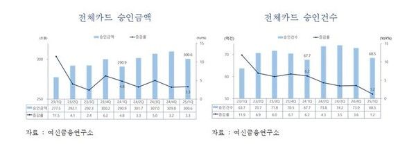 뉴시스 보도에 따르면, 30일 여신금융협회에 따르면 올해 1분기 전체카드 승인금액은 300조6000억원으로 전년비 3.3% 늘었다. 같은 기간 전체카드 승인건수는 1.2% 증가한 68억5000건을 기록했다.