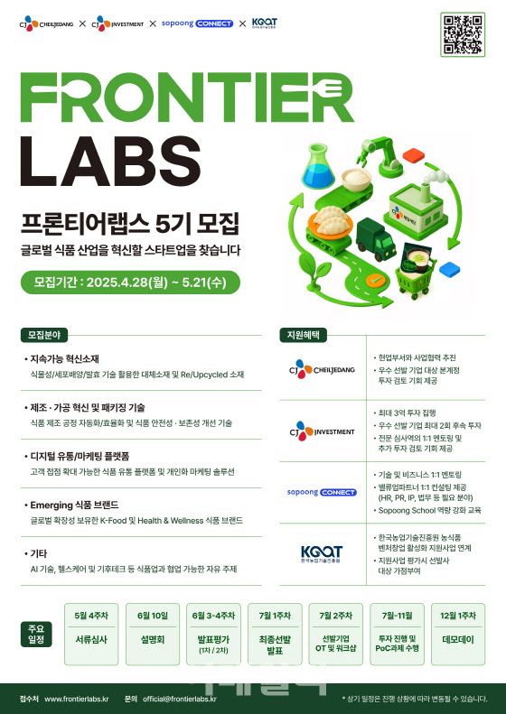 모집분야는 지속가능 혁신소재, 제조 및 가공 혁신 및 패키징 기술, 디지털 유통·마케팅 플랫폼, 트렌드 선도(Emerging) 식품 브랜드 등이다. 이 외에도 AI 전문 기술, 헬스케어, 기후테크 등 CJ제일제당과 시너지를 낼 수 있는 사업 분야의 스타트업은 누구나 지원할 수 있으며, 모집기간은 다음달 21일까지다.