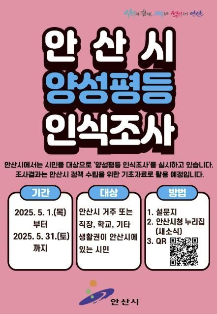 안산시민을 대상으로 하는 이번 설문은 설문지를 직접 작성하거나 안산시청 누리집 ‘새소식’란에 있는 QR코드를 활용해 참여할 수 있다. 수집된 결과는 향후 안산시 양성평등 정책 수립을 위한 기초자료로 적극 활용될 예정이다.