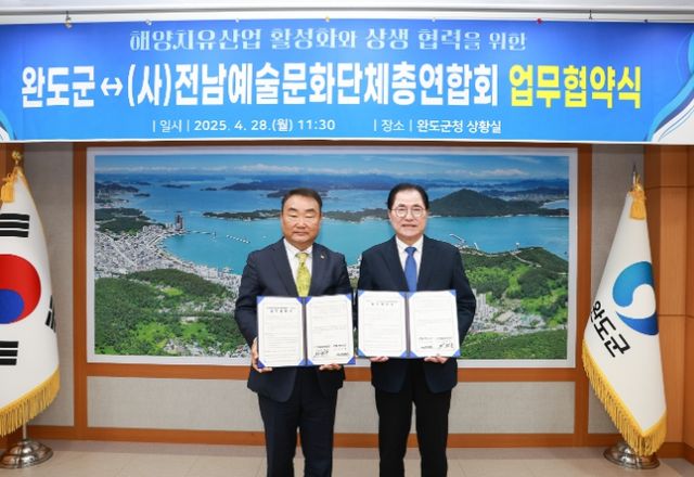 협약식은 4월 28일 완도군청 상황실에서 진행됐으며, 신우철 완도군수와 임점호 전남예총 회장을 비롯한 관계자들이 참석했다.