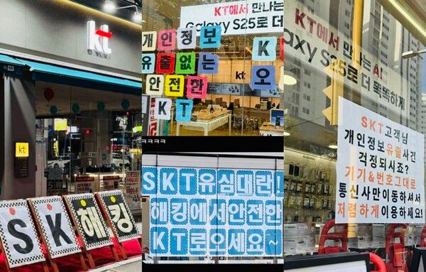 온라인 커뮤니티에는 관련 사례를 촬영한 게시물이 잇따라 올라오고 있다. 한 KT 대리점은 매장 앞에 "SK 해킹"이라고 적힌 대형 입간판을 설치했고, 또 다른 매장은 유리 벽에 "SKT 유심 대란! 해킹에서 안전한 KT로 오세요"라는 문구를 크게 내걸었다.